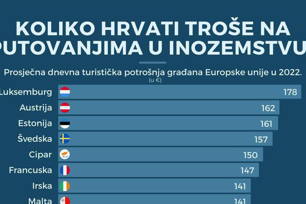 ZANIMLJIVA INFOGRAFIKA Koliko Hrvati troše na putovanjima u inozemstvo? Više od Slovenaca, ali manje europskog prosjeka Infografika, koju je objavio Pixsell, prikazuje prosječnu dnevnu turističku potrošnju građana Europske unije u 2022. godini