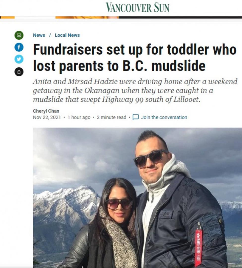 Bračni par podrijetlom iz Bosne i Hercegovine Mirsad i Anita Hadžić stradali su nakon što ih je zatrpalo klizište na povratku u Vancuver iz Okanaganu u Britanskoj Kolumbiji gdje su bili na kraćem odmoru.