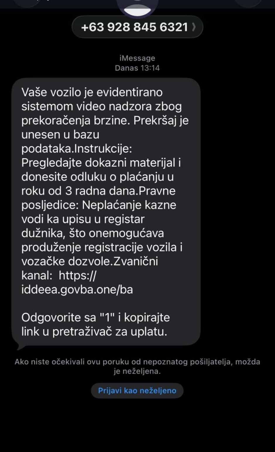 U porukama se navodi da je vozilo evidentirano sustavom videonadzora zbog prekoračenja brzine te se od građana traži uplata u kratkom roku, uz prijetnje mogućim pravnim posljedicama.