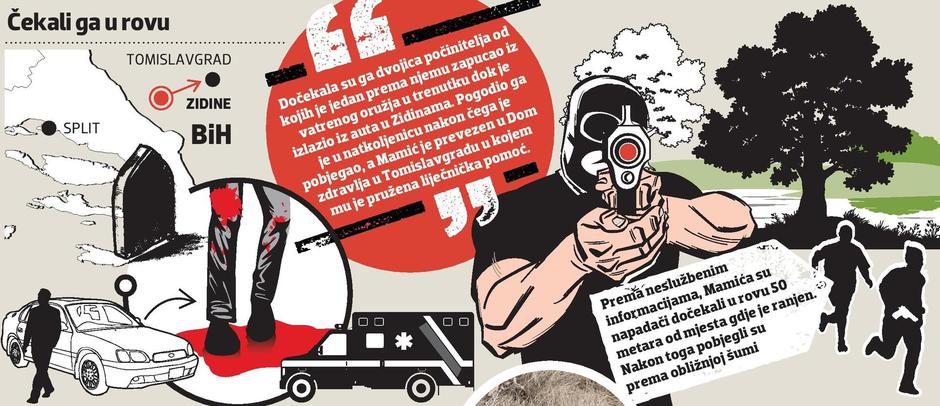 A to ozljeđivanje zapravo je bilo, ono što će policija vrlo vjerojatno okarakterizirati kao pokušaj ubojstva, Mamićevo ranjavanje u zaseoku Vidovići i to točno na mjestu gdje je prije nekoliko godina umro njegov otac Josip. Na Mamića su pucale najvjerojatnije dvije osobe, a po svemu sudeći radi se o pomno planiranom napadu. Jer prema riječima očevidaca, dvojac koji je pucao u Mamića, pogodivši ga u natkoljenicu, čekao ga je blizu spomenika koji je Mamić podigao svom ocu. Bili su ukopani u rov udaljen 50 metara od spomenika i u njemu su navjerojatnije čekali danima.