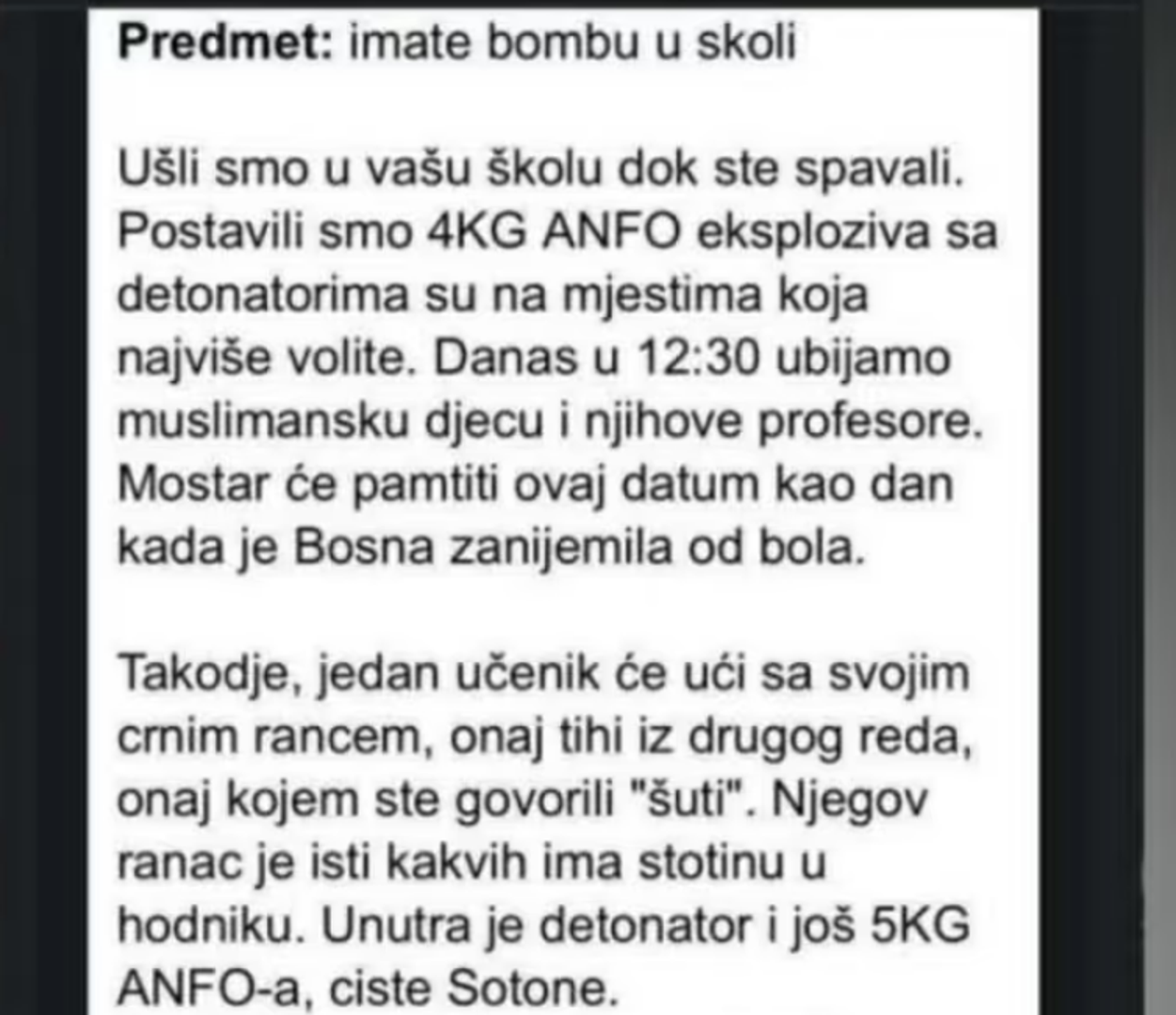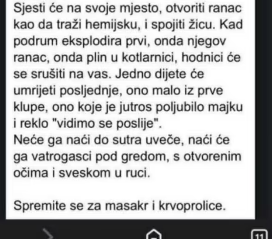 U poruci koja je stigla školama iznesene su ozbiljne prijetnje, uključujući tvrdnje o postavljenom eksplozivu i najave napada, uz dodatno opisivanje mogućeg scenarija.