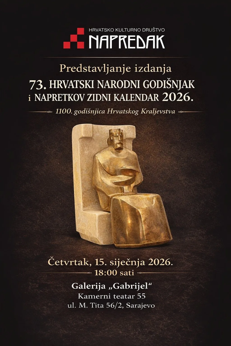 Hrvatsko kulturno društvo Napredak najavilo je predstavljanje 73. Hrvatskog narodnog godišnjaka i Napretkovog zidnog kalendara za 2026. godinu, posvećenog 1100. godišnjici Hrvatskog Kraljevstva, koje će se održati u četvrtak, 15. siječnja 2026. godine u 18:00 sati u Galeriji “Gabrijel”, Kamerni teatar 55, ul. M. Tita 56/2 u Sarajevu.