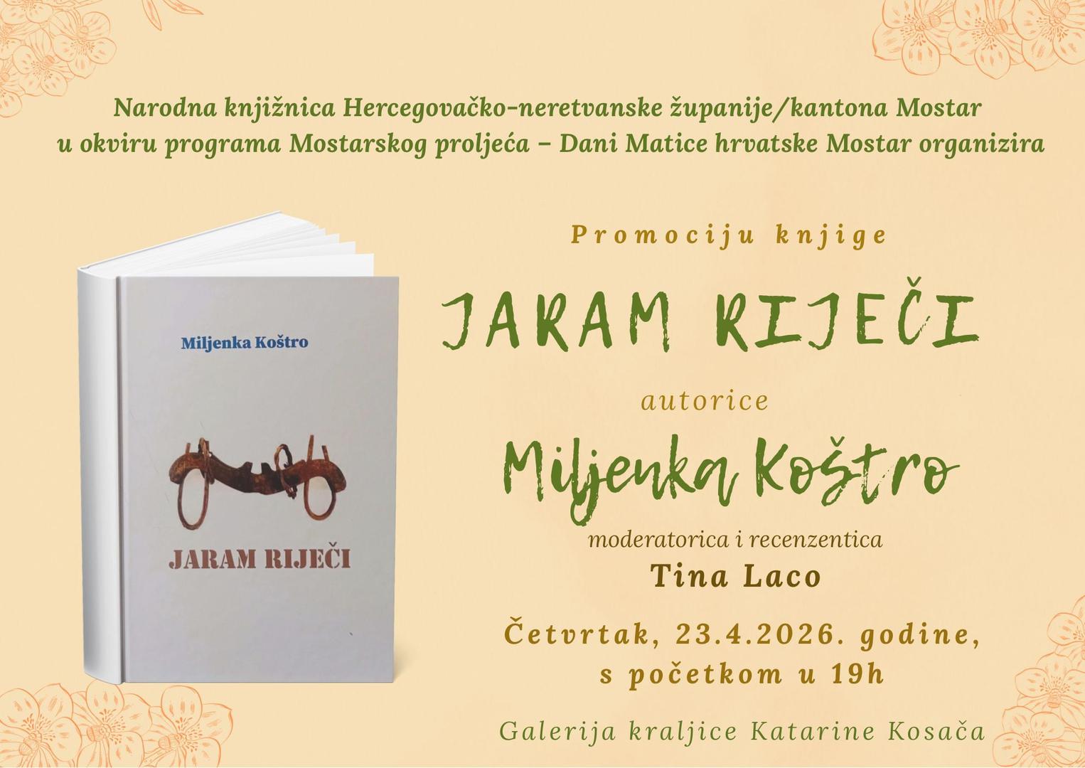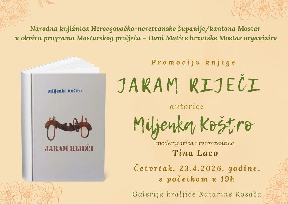 Predstavljanje knjige Miljenke Koštro "Jaram riječi" u Galeriji kraljice Katarine u Hrvatskome domu hercega Stjepana Kosače u četvrtak 23. travnja u 19 sati otvorit će književni program Mostarskoga proljeća 2026. – XXVIII. Dana Matice hrvatske. Riječ je o devetoj knjizi autorice, a šestoj zbrirci poezije.