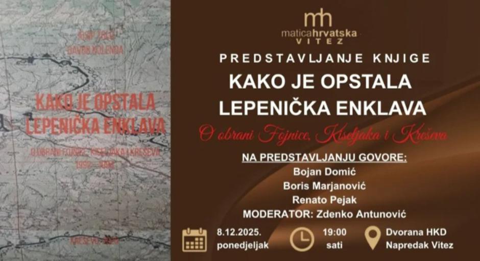 Matica hrvatska Vitez i Hrvatski dokumentacijski centar Domovinskog rata BiH organiziraju predstavljanje knjige „Kako je opstala Lepenička enklava: O obrani Fojnice, Kiseljaka i Kreševa 1992.–1994.”, autora Josipa Tole i Davora Kolende.