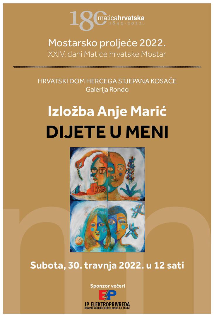 Jedan od najtalentiranijih bosanskohercegovačkih likovnih umjetnica Anja Marić, predstavit će se publici na ovogodišnjem 24. Mostarskom proljeću. Izložba pod nazivom Dijete u meni bit će otvorena, u subotu 30. travnja u 12 sati, u Galeriji Rondo Hrvatskog doma hercega Stjepana Kosače.