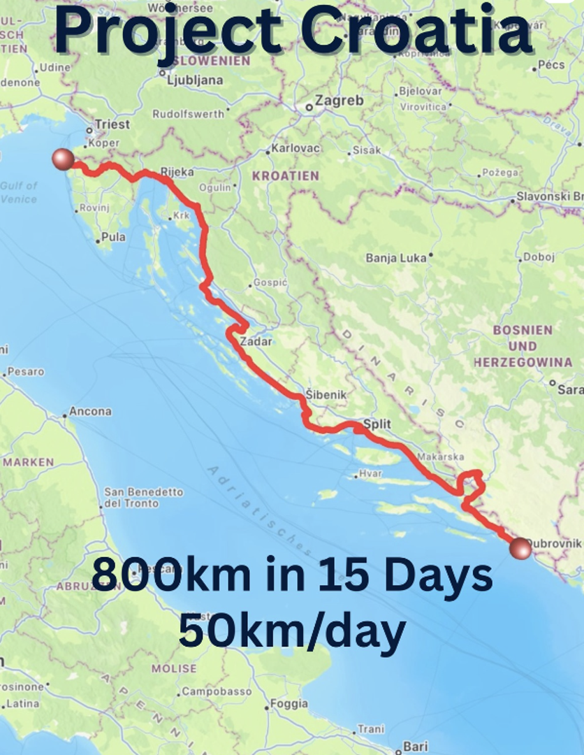 Kada je krenuo trčati bilo mu je teško prijeći 5 kilometara, a onda i 10, ali kada je jednom uspio pretrčati 40 sve je postalo lakše. U Hrvatskoj će morati pretrčati dnevno više od 50 kilometara želi li u petnaest dana proći željenu rutu, što je fizički i mentalni izazov. Na njegovom Instagram profilu je ucrtana ruta od Istre do Konavala.
