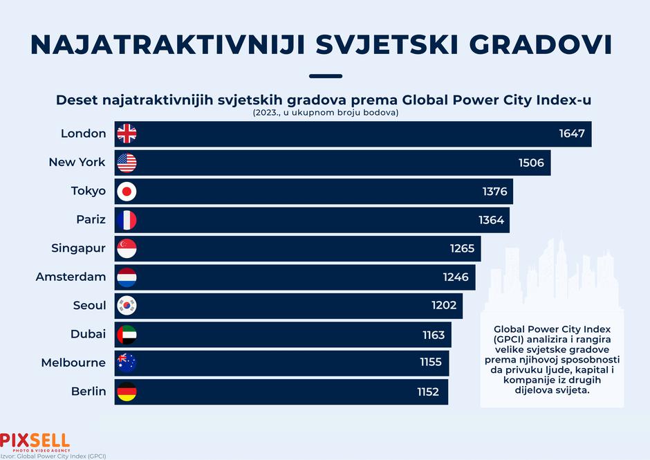 Listu deset najatraktivnijih gradova, prema Global Power City Indexu, predvode London i New York. GPCI, naime, analizira i rangira svjetske gradove prema njihovoj sposobnosti da privuku ljude, kapital i kompanije iz drugih dijelova svijeta.