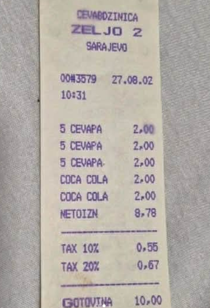 Na računu iz Ćevabdžinice Željo, koji je iznosio 10 maraka, moglo se kupiti tri porcije ćevapa i dvije Coca-Cole.