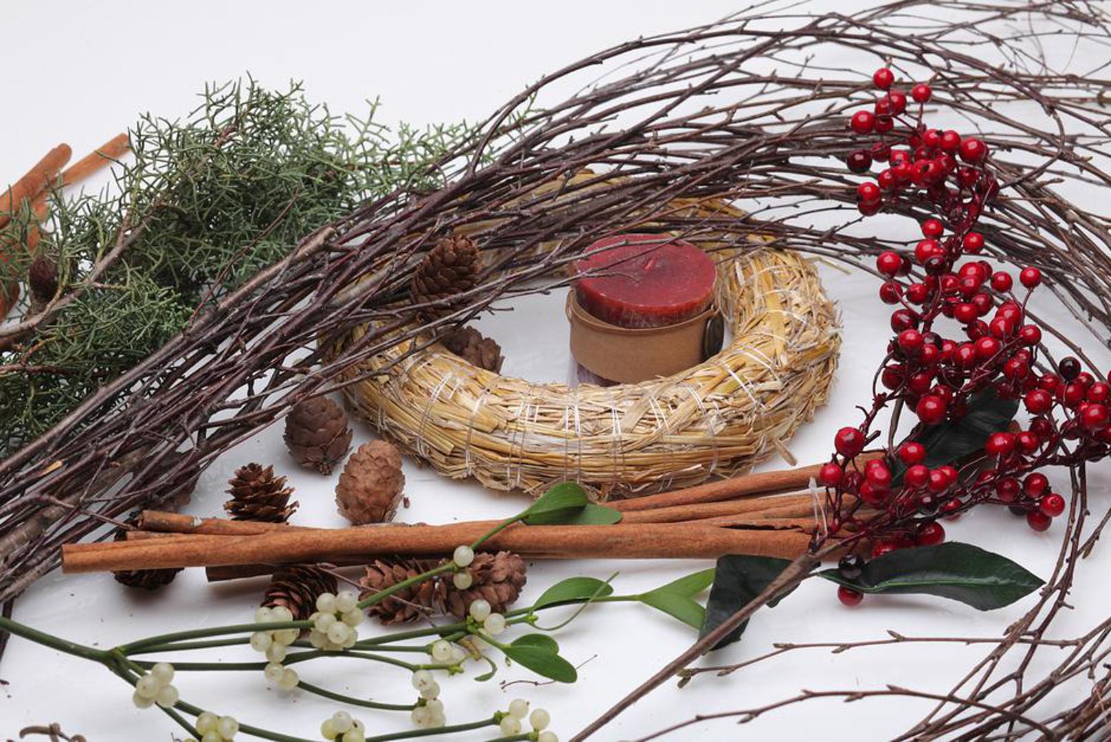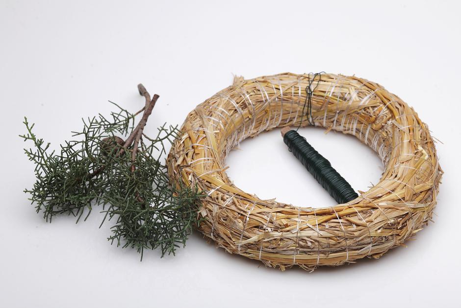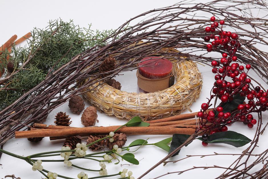 KORAK 1: Pripremite vjenčić, žicu, grančice prirodne imele, grančice umjetne božikovine, šibe (ima ih na tržnici i u veleprodaji), četiri svijeće, debelu žicu, češere, prutiće cimeta, grančice čempresa, pinusa i pačempresa.