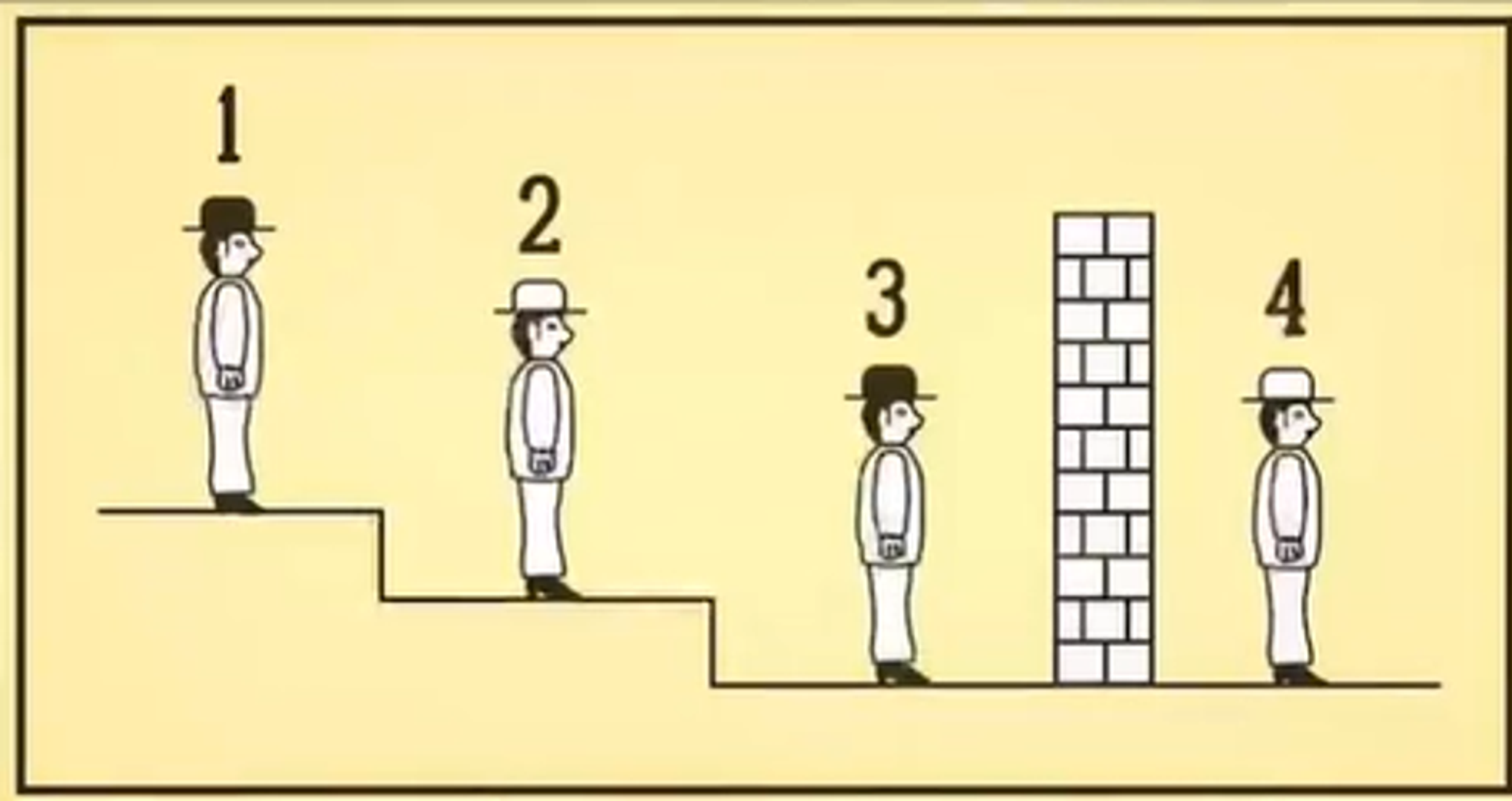 Zagonetka o zatvoreničkom šeširu: Četiri zatvorenika stoje na stubištu, svi okrenuti prema istom smjeru. Ispred njih je zid od opeke koji dijeli zatvorenika broj 4 od ostalih trojice.