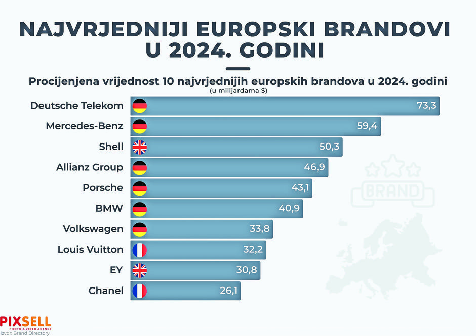 Europski brendovi koji su na listi najvrjednijih tijekom 2024. prikazani su u milijardama dolara. Od deset najvrjednijih, njih čak šest je iz Njemačke. Prvo mjesto pripada Deutsche Telekomu s vrijednosti od 73,3 milijarde dolara, zatim Mercedes-Benzu koji vrijedi 59,4 milijarde. Treće mjesto pripada britanskom Shellu s vrijednosti od 50,3 milijarde dolara.