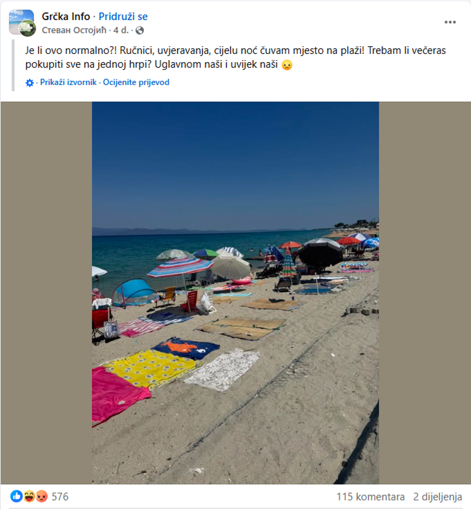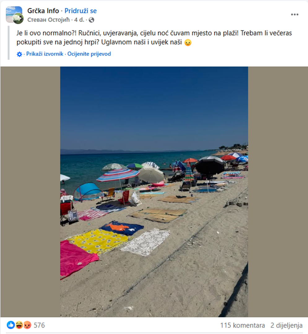 U jednoj grčkoj Facebook grupi, jedan državljanin Srbije objavio je fotografiju gotovo prazne plaže, prekrivene suncobranima i ručnicima. Ljudi nema, ali mjesta su — zauzeta. Uz fotografiju je napisao: "Je l’ ovo normalno?! Ručnici, uvjeravanja, cijelu noć čuvam mjesto na plaži! Trebam li večeras pokupiti sve na jednu hrpu? Uglavnom naši i uvijek naši."
