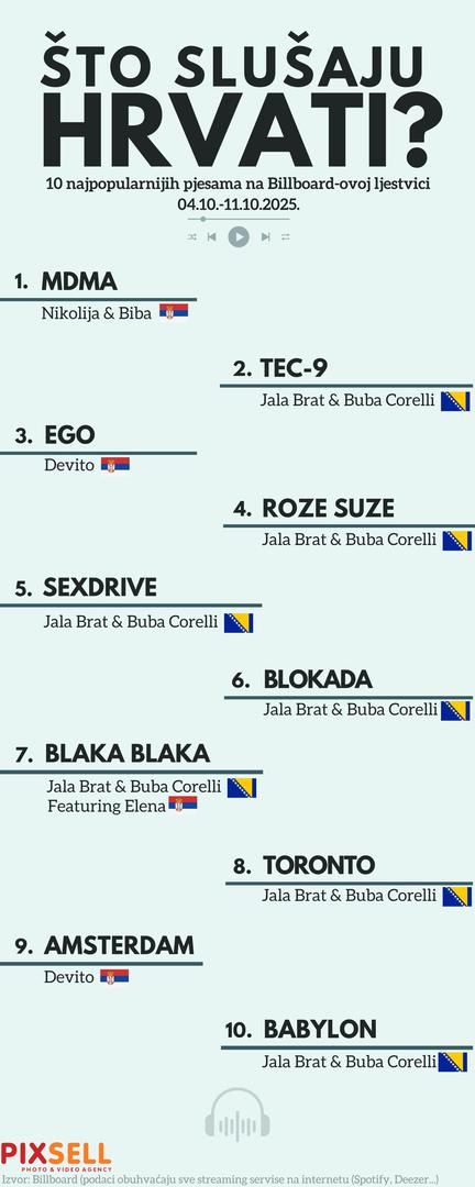 Prema Billboardovoj ljestvici za razdoblje od 4. do 11. listopada 2025., hrvatske top liste preplavili su regionalni izvođači. Na prvom mjestu nalazi se pjesma "MDMA" koju izvode Nikolija & Biba iz Srbije. Odmah iza njih, drugo mjesto zauzeli su Jala Brat & Buba Corelli s pjesmom "TEC-9", dok je treći Devito s hitom "Ego".
