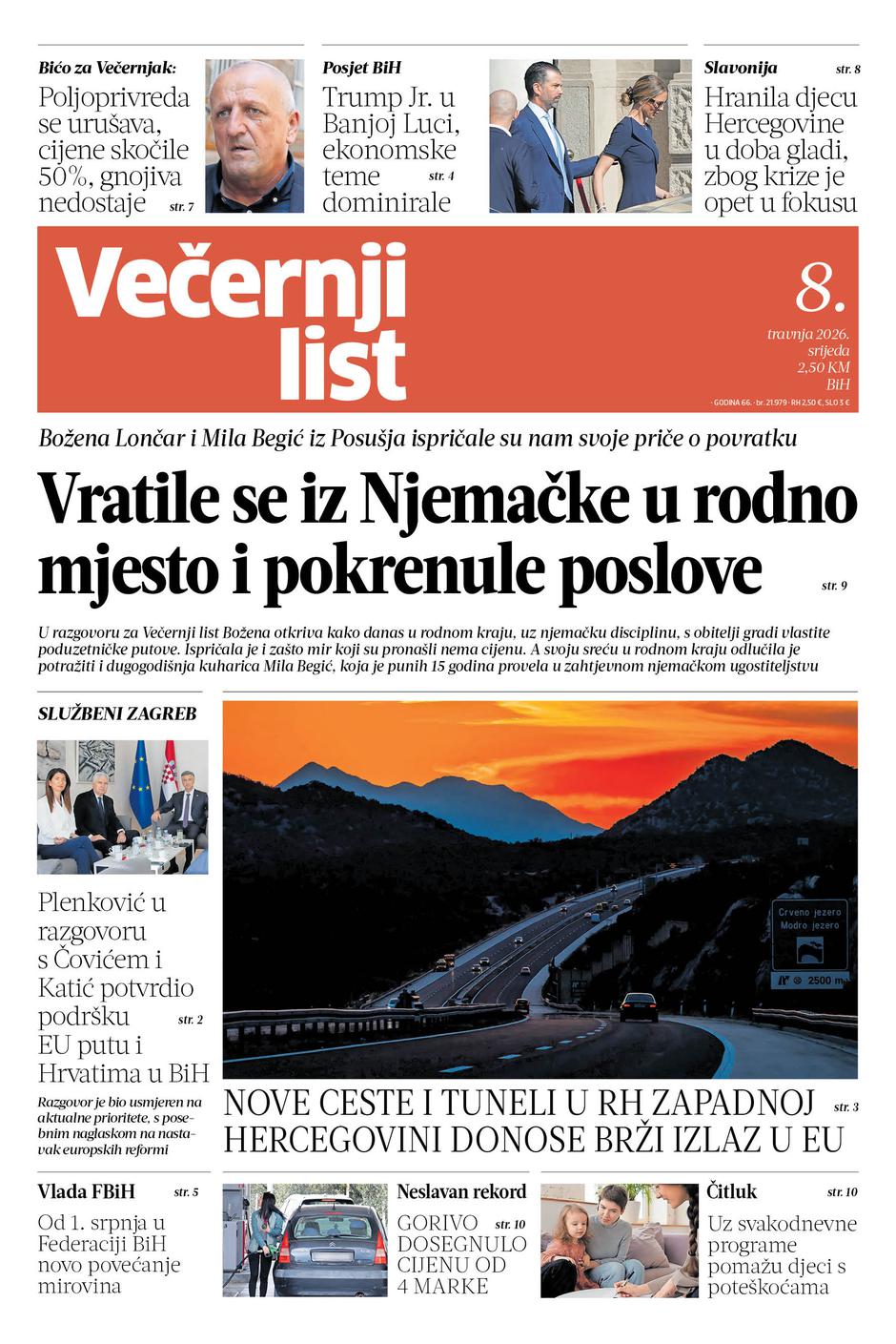 Tiskano izdanje Večernjeg lista BiH, 8. travnja 2026. godine, donosi teme koje utječu na svakodnevni život građana, od povećanja mirovina, cijena goriva, problema u poljoprivredi, obljetnici HVO-a, pa do gradilišta, povratka iz Njemačke i drugih zanimljivih priča.