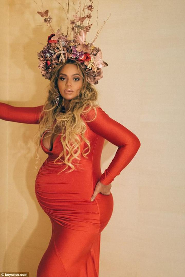 S ogromnom krunom od cvijeća na glavi i utegnuta u usku crvenu haljinu Beyonce (35) je pozirala za fotografiju koju je objavila na svojoj službenoj stranici i oduševila obožavatelje. Pjevačica je na 'fotki' pokazala trudnički trbuh i impresivni dekolte.