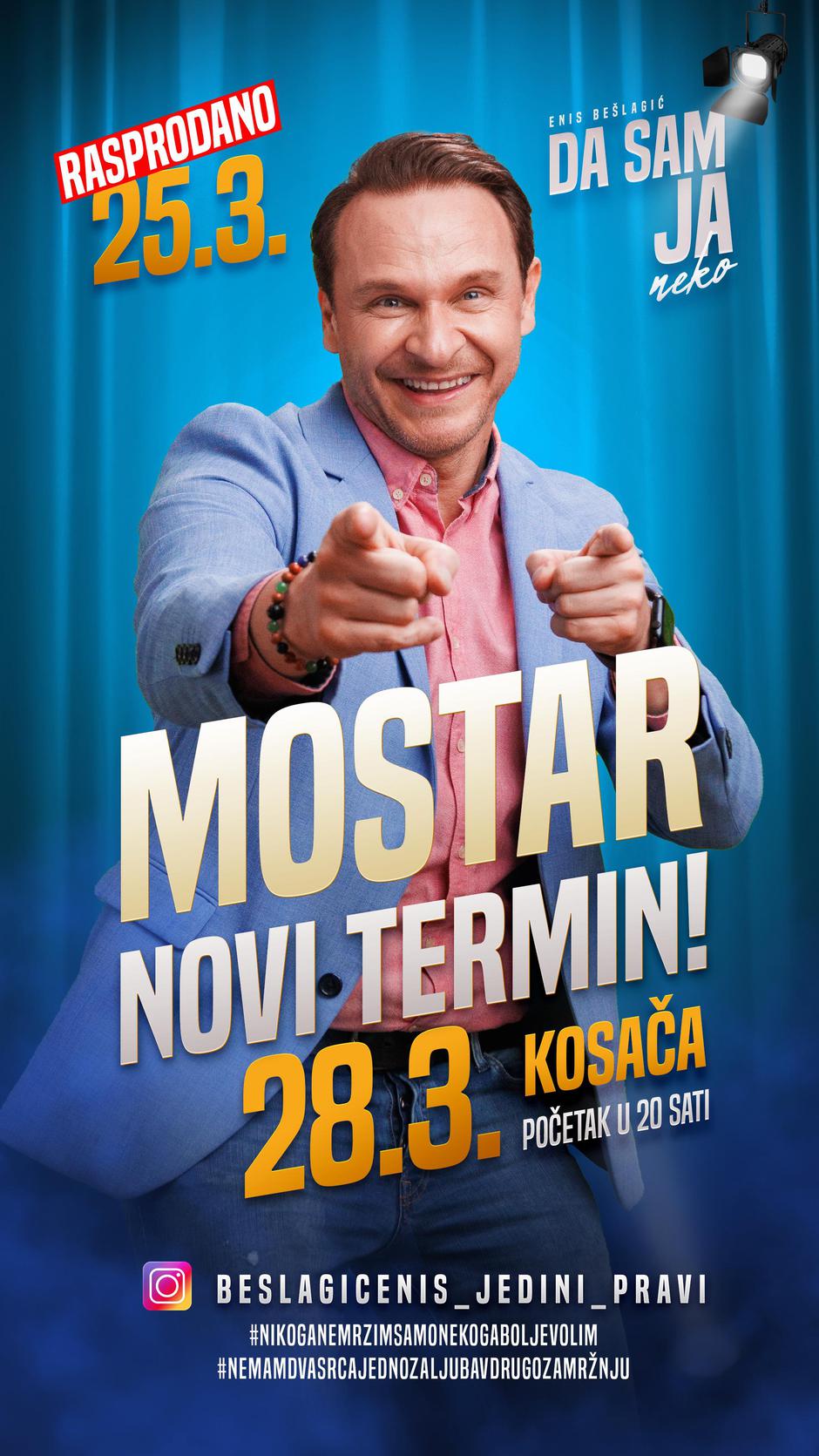 Glumac Enis Bešlagić dobro je poznato televizijsko lice i veliki prijatelj Večernjeg lista. Trenutačno ga gledamo u ulozi člana žirija na programu Nove TV u novoj sezoni zabavnog showa "Tvoje lice zvuči poznato", a uskoro ćemo ga imati priliku gledati uživo u Mostaru, gdje će 25. i 28. ožujka, u dva termina, odigrati svoju prvu autorsku predstavu naslovljenu "Da sam ja neko". Predstava je to koja donosi prikaz glumčeva životnog puta od školskih, preko studentskih dana pa sve do osobe koja je danas naširoko poznata.