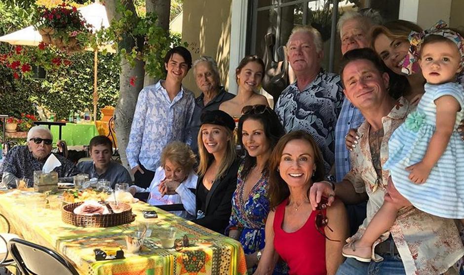 Četiri generacije za jednim stolom - lijepo je vidjeti veliku obitelj na okupu, njih četrnaest. Najstariji član obitelji, Kirk Douglas (102) sa suprugom Annom (100) okupili su se s glumcem Michaelom Douglasom (74) i njegovom suprugom, glumicom Catherinom Zeta-Jones (49). Njihovi sinovi - Cameron (40), Dylan (19) i kćer Carys (16) također su bili tamo. Najmlađa članica obitelji je uskoro dvogodišnja Cameronova kćer Lua Izzy, piše Gloria.hr.