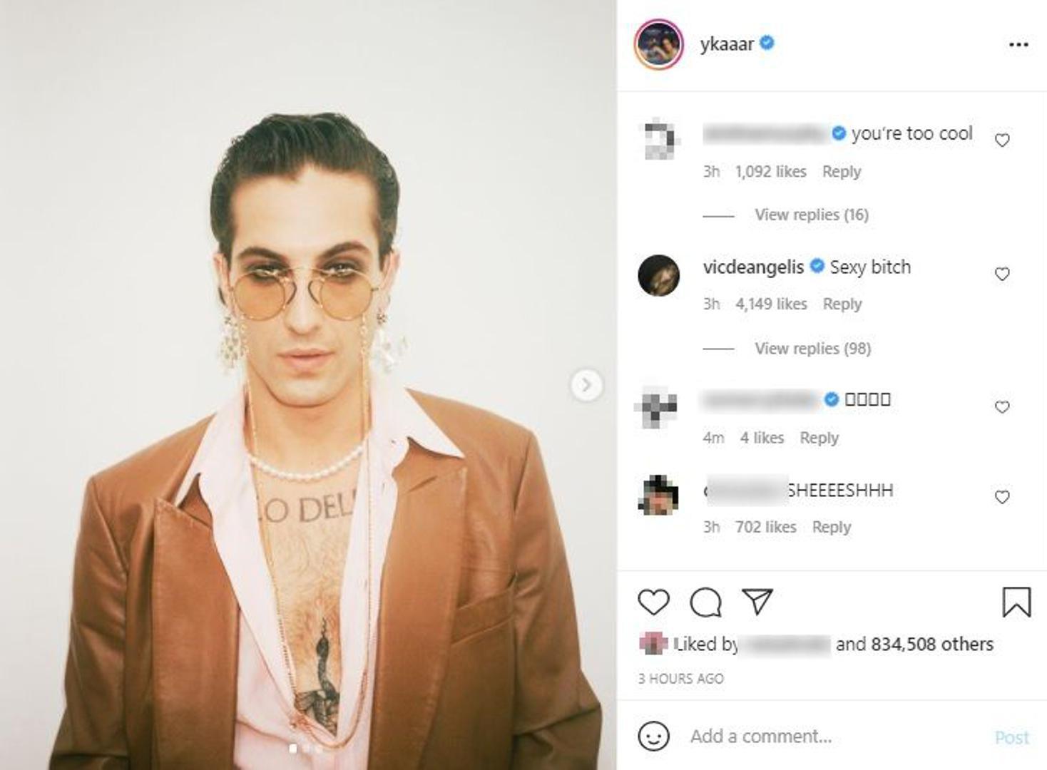 Damiano David, pjevač grupe Måneskin koja je ove godine pobijedila na Euroviziji, na Instagramu ima sve više pratitelja, među kojima prevladava ljepši spol. Trenutačno ima 3,6 milijuna pratitelja, a danas ih je počastio novom fotografijom na kojoj nosi velike naušnice i bisernu ogrlicu te jaku šminku oko očiju.