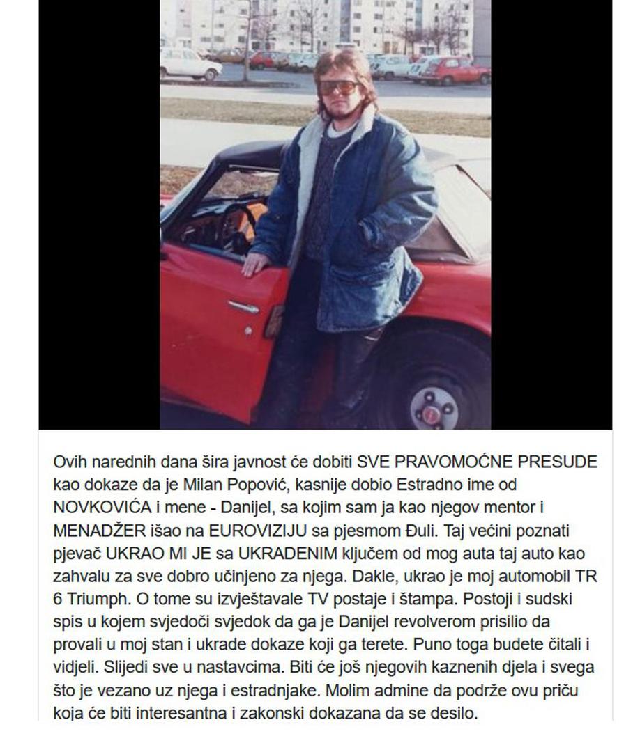 - Ovih narednih dana šira javnost će dobiti sve pravomoćne presude kao dokaze da je Milan Popović, kasnije dobio estradno ime od Novkovića i mene - Danijel, s kojim sam ja kao njegov mentor i menadžer išao na Eurovoziju sa pjesmom Đuli. Taj većini poznat pjevač ukrao mi je sa ukradenim ključem od mog auta taj auto kao zahvalu sa sve dobro učinjeno za njega. Dakle ukrao je moj automobil TR 6 Triumph. O tome su izvještavale TV postaje i štampa. Postoji i sudski spis u kojem svjedoči svjedok da ga je Danijel revolverom prisilio da provali u moj stan i ukrade dokaze koji ga terete. Puno toga budete čitali i vidjeli. Biti će još njegovih kaznenih djela i svega što je vezano uz njega i estradnjake. Molim admine da podrže ovu priču koja će biti interesantna i zakonski dokazana da se to dogodilo - napisao je sa svog profila na Facebooku 15. travnja, pa se dva tjedna kasnije opet oglasio sljedećim tekstom: