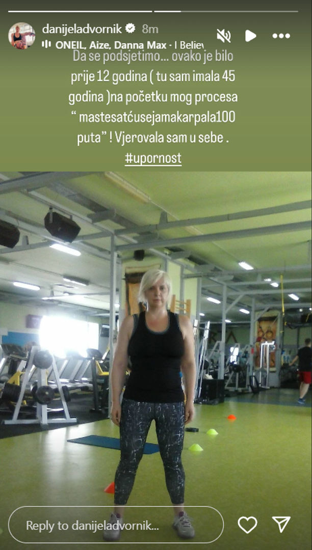Poznata influencerica i blogerica Danijela Dvornik još jednom je podsjetila svoje pratitelje koliko je daleko stigla u svojoj osobnoj transformaciji. U najnovijoj objavi na Instagramu, Danijela je podijelila staru fotografiju iz teretane, snimljenu prije 12 godina, kada je imala 45 godina — na samom početku svog fitness putovanja. "Da se podsjetimo… ovako je bilo prije 12 godina (tu sam imala 45 godina) na početku mog procesa ‘mastesatćusejamakarpala100 puta’! Vjerovala sam u sebe. #upornost", napisala je uz fotografiju, jasno pokazujući koliko su trud, upornost i vjera u sebe ključni za bilo kakvu promjenu.