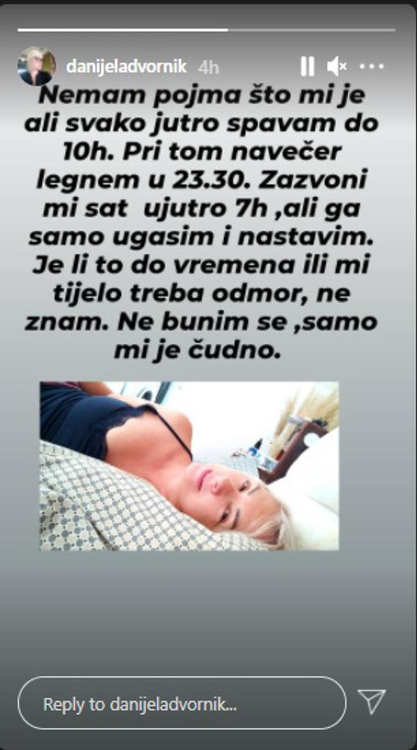 Blogerica i influencerica Danijela Dvornik (54) otkrila je na Instagramu kako u posljednje vrijeme ima problema sa spavanjem. Dok nekima smetaju ove vrućine, blogerica s tim nema problema. Kako je kazala, spava dulje nego dosad. - Nemam pojma što mi je, ali svako jutro spavam do deset sati. Pri tom navečer legnem u 23 i 30. Zazvoni mi sat ujutro u sedam sati, ali ga samo ugasim i nastavim. Je li to do vremena ili mi tijelo treba odmor, ne znam. Ne bunim se, samo mi je čudno, napisala je Dvornik.