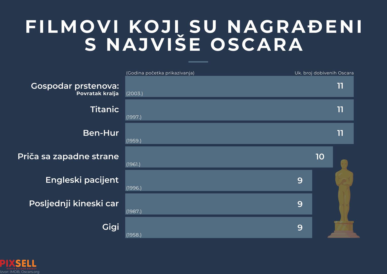 Infografika prikazuje popis filmova koji su nagradjeni s najvise nagrada Oscar do sada. Prijestolje dijele tri filma koja su osvojila po 11 Oscara, a to su Gospodar prstenova: Povratak kralja, Titanik i Ben-Hur. Hoce li se to promijeniti, saznat cemo na 96. dodjeli nagrada koja ce se odrzati danas?