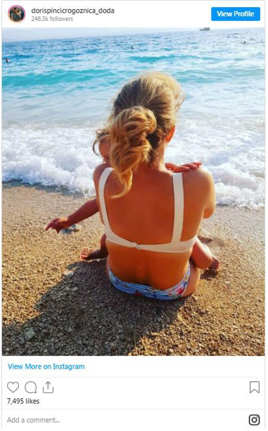 Voditeljica i glumica Doris Pinčić Rogoznica objavila je fotku s plaže. Doris se na plaži sunčala s malenom kćerkicom Gitom.  Iako je slikana s leđa, vidi se da je Doris u badiću.