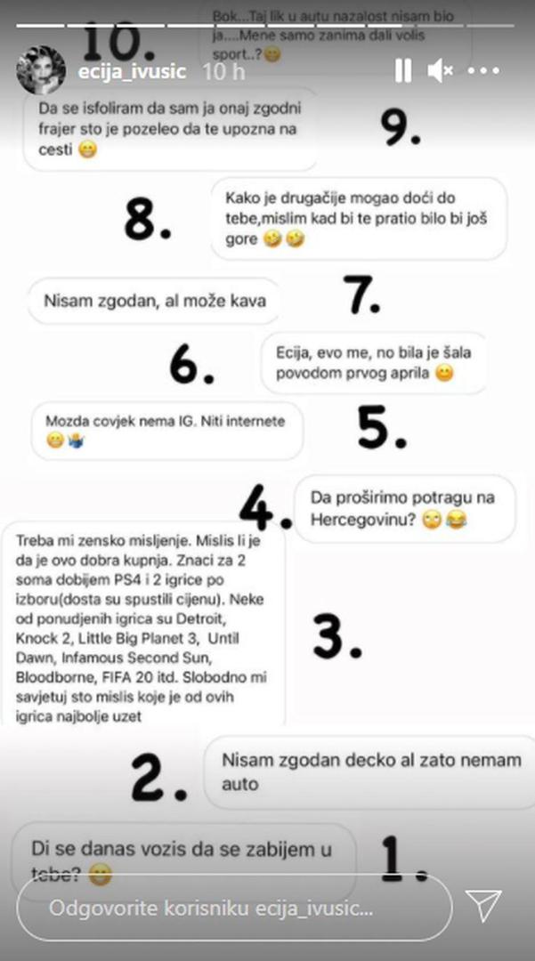 Podsjetimo, Ecija je svojim pratiteljima na Instagramu ispričala anegdotu s tajanstvenim muškarcem. "Ljudi su već toliko ludi od svega da se čovjek sad upravo vozio paralelno pored mene, iza mene jer ja nisam htjela spustiti prozore da vidim što hoće. Kad sam napokon spustila prozor jer sam vidjela da ćemo se zabiti jedno u drugo, pitao me možemo li se upoznati. Što je najbolje, bio je fakat zgodan, ali mi je to bilo jako freaky i rekla sam ne. Izgovor je bio da imam psa", ispričala je Ecija u videu i priznala da se ubrzo pokajala.