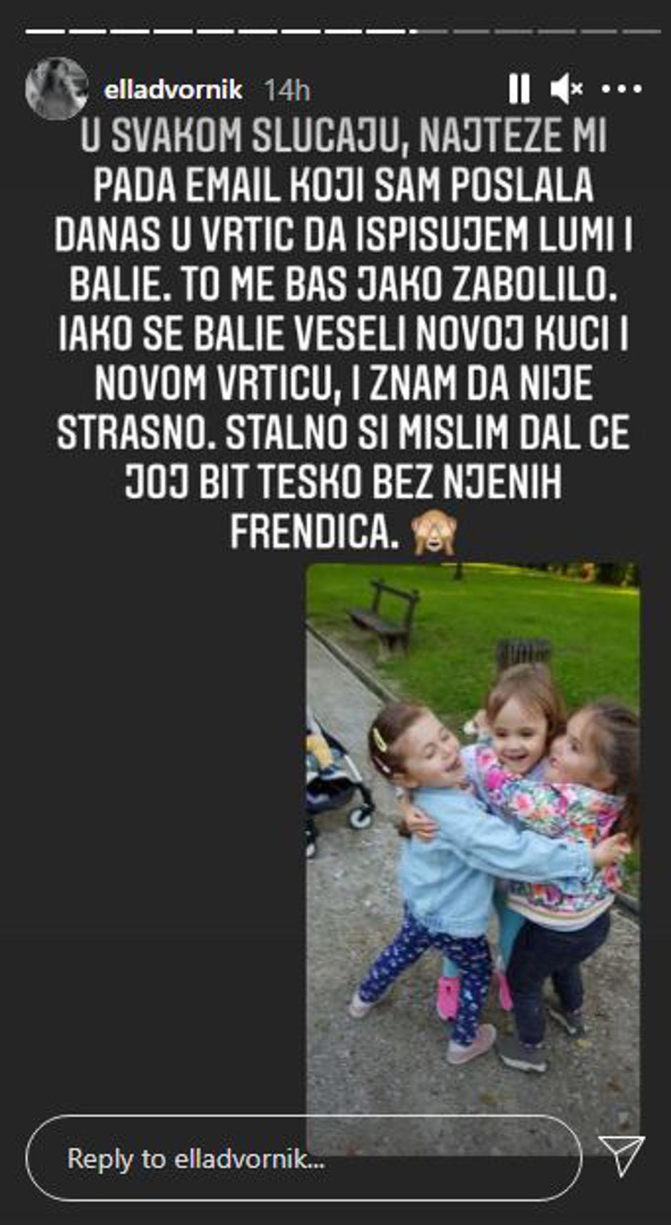 "U svakom slučaju, najteže mi pada e-mail koji sam poslala danas u vrtić da ispišem Lumi i Balie. To me baš jako zaboljelo. Iako se Balie veseli veseli novoj kući i novom vrtiću, i znam da nije strašno. Stalno si mislim dal će joj bit teško bez njenih frendica", napisala je Ella i nastavila: