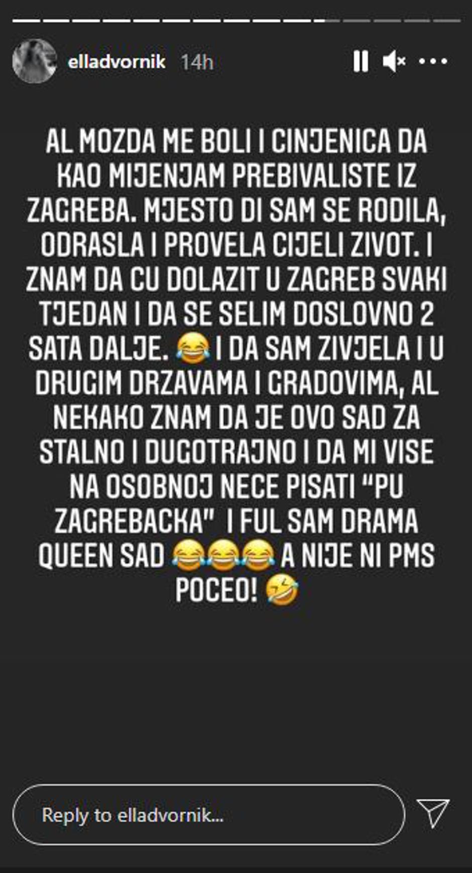 "Al možda me boli i činjenica da kao mijenjam prebivalište iz Zagreba. Mjesto gdje sam se rodila, odrasla i provela cijeli život. I znam da ću dolazit u Zagreb svaki tjedan i da se selim doslovno dva sata dalje. I da sam živjela i u drugim državama i gradovima, al nekako znam da je ovo sad za stalno i dugotrajno i da mi više na osobnoj neće pisati "PU zagrebačka", zaključila je Ella.