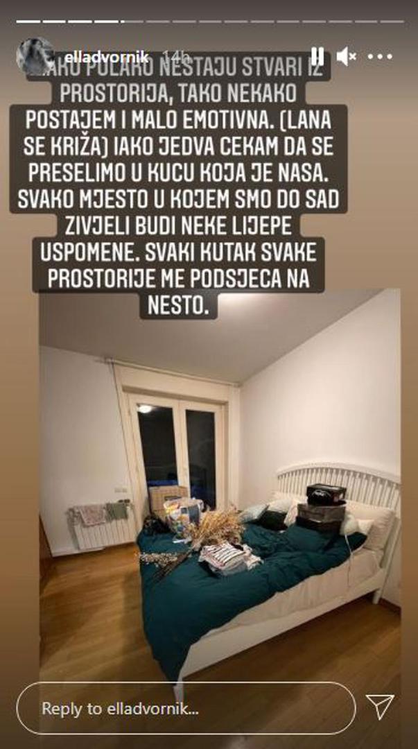 Naime, rekla je da joj je ovo razdoblje jako stresno, a sada je na Instagram storyjima napisala zapravo koliko joj sve teško pada. "Kako polako nestaju stvari iz prostorija, tako nekako postajem i malo emotivna. Iako jedva čekam da se preselimo u kuću koja je naša. Svako mjesto u kojemu smo dosad živjeli budi neke lijepe uspomene. Svaki kutak svake prostorije me podsjeća na nešto", započela je Ella i zatim fotkala kupaonicu i prisjetila se kupanja s curama, Balie i Lumi. Također, podijelila je i Balieinu sobu u kojoj je provela karantenu, ali i dnevni boravak gdje je Lumi napravila svoje prve korake.