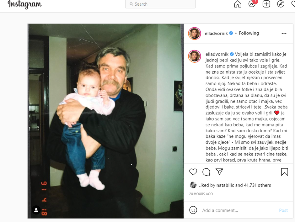 Influencerica Ella Dvornik (30) na svojem je Instagram profilu podijelila fotografiju iz djetinjstva na kojoj je drži djed Boris. "Voljela bih zamisliti kako je jednoj bebi kad ju svi tako vole i grle. Kad samo prima poljupce i zagrljaje. Kad ne zna ni za što što ju očekuje i što svijet donosi. Kad je svijet nježan i posvećen samo njoj. Nekad ta beba i odraste. Onda vidi ovakve fotke i zna da je bila obožavana, držana na dlanu, da su je svi ljudi gradili, ne samo otac i majka, već djedovi i bake, stričevi i tete…Svaka beba zaslužuje da ju se ovako voli i grli. Ja iako sam sad već i sama majka, osjećam se nekad kao beba, kad me mama pita kako sam? Kad sam došla doma? Kad mi baka kaže “ne mogu vjerovati da imaš dvoje djece” - Mi smo svi zauvijek nečije bebe. Mogu zamisliti da je jako lijepo biti beba, čak i kad se neke stvari čine teške, kao prvi koraci, prva kruta hrana, prve riječi… To je ono što čini život zanimljivim… Te prve stvari…Jeste i vi nečija beba?", napisala je Ella u opisu objave.