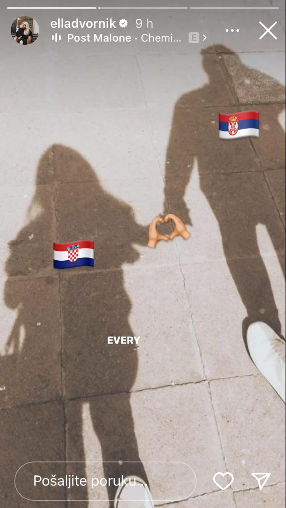 Ella je u kasne noćne sate u pričama na Instagramu objavila dvije fotografije koje daju naslutiti kako se na njenom privatnom planu nešto događa. Riječ je o siluetama dvije osobe, u konkretnom slučaju sjeni zagrljenih žene i muškarca, a uz sliku je priložena i ljubavna pjesma 'I Like You'. I ako je netko pomislio da na prvoj fotografiji nije Dvornikova, ona je sve sumnje otklonila drugom na kojoj se drži za ruke s nepoznatim muškarcem, uz priloženi emotikon ruke u obliku srca te hrvatskom i srpskom zastavom, na osnovu čega se može zaključiti kako je sreću pronašla u susjednoj državi.