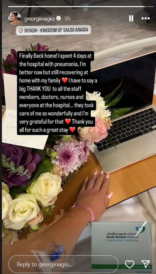 'Napokon sam ponovno kod kuće! Provela sam četiri dana u bolnici zbog upale pluća. Bolje sam, ali i dalje se oporavljam okružena obitelji', poručila je Georgina Rodriguez dok se pridržavala za krevet.