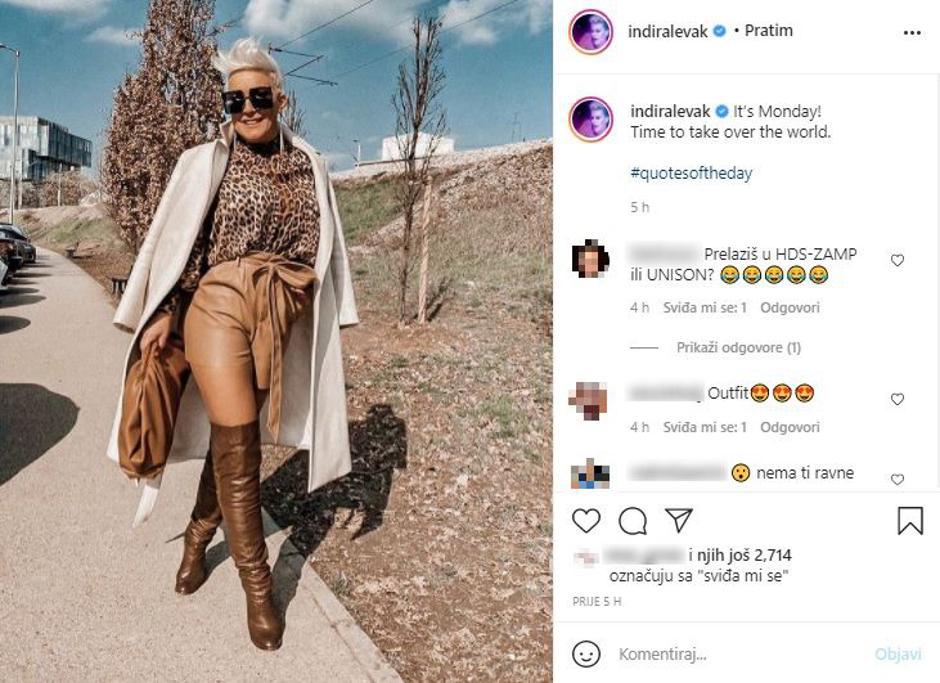 Pjevačica Indira Levak (47) iskoristila je sunčan dan za šetnju Zagrebom, a svojim stajlingom oduševila je pratitelje na Instagramu.  "Ponedjeljak je! Vrijeme je da zavladam svijetom," napisala je pokraj fotografije na kojoj uz kožne hlačice nosi i bež kaput, košulju leopard-uzorka i čizme koje sežu iznad koljena. Fotografija je u samo nekoliko sati dobila skoro 3000 lajkova i puno pozitivih komentara njenih fanova koji su je obasuli komplimentima.