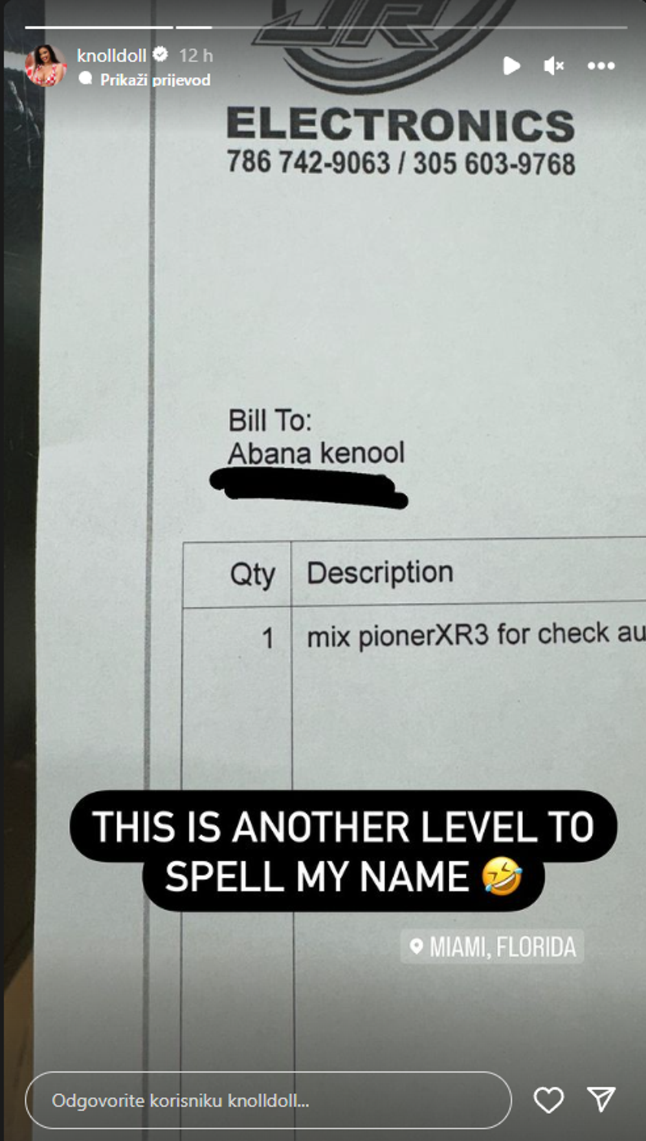 Nakon toga je objavila i račun iz jedne trgovine, na kojem se visi da su Amerikanci njeno ime napisali kao Abana Kenool.