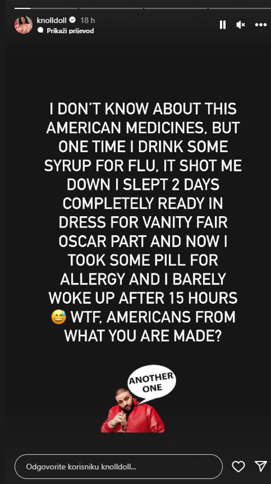 - Jednom sam popila neki sirup za gripu i oborio me da sam dva dana spavala kompletno sređena u haljini za Vanity Fair Oscar party. Sada sam uzela tabletu za alergiju i jedva sam se probudila nakon 15 sati. Koji vrag? Amerikanci, od čega ste napravljeni? , upitala se Ivana.