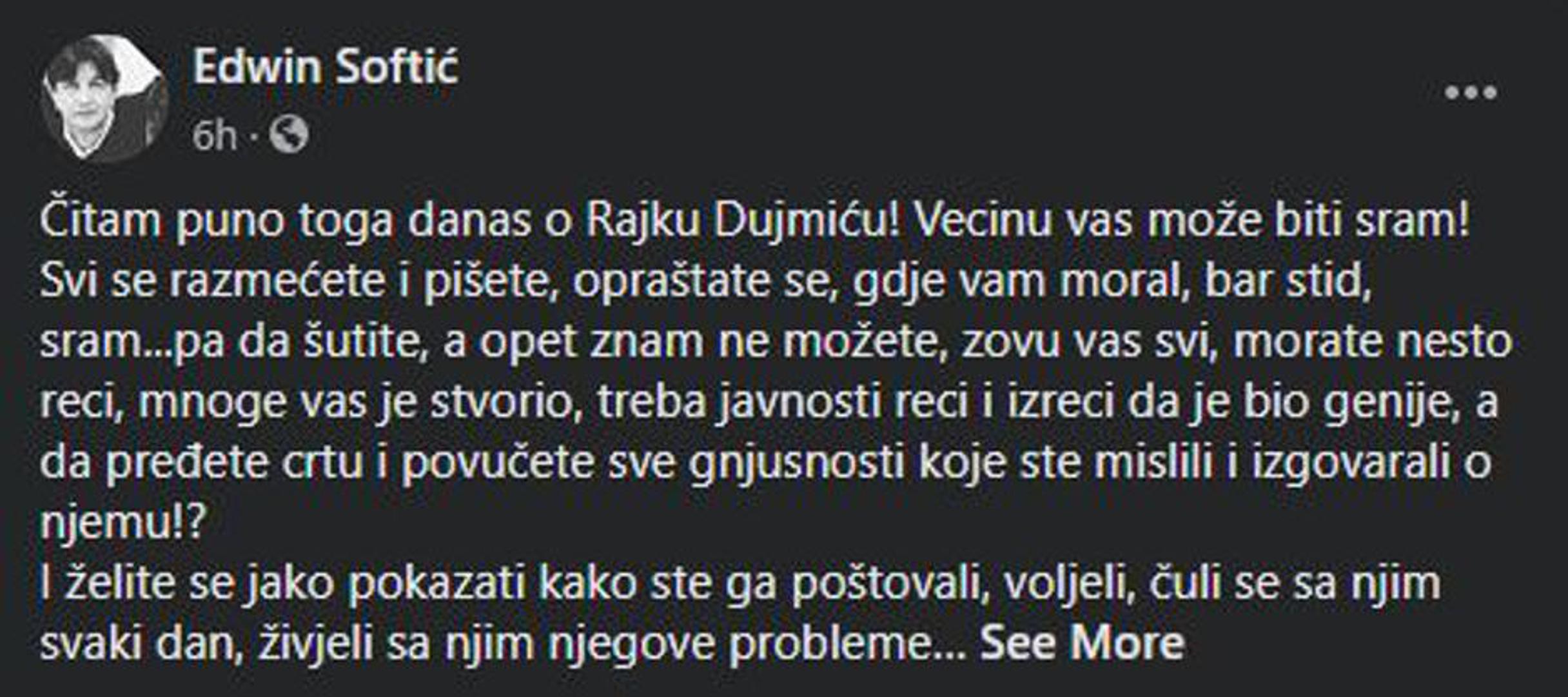 "Dobit ću puno neprijatelja, radi ovog što pišem, ali s neprijateljima sam naučio živjeti, on nije znao i nije mogao to podnijeti! To ga je ubijalo i na kraju ubilo! Ja ni jednu fotku s njim neću objaviti, to su naše uspomene, niti ću se bilo čime hvaliti, ali bio sam u tim estradnim 'govnima' 35 godina. Znam tko ste, što ste i vjerujem da sam ga bolje poznavao od vas mnogih kojima je podario sebe u svojim pjesmama, ali zaborav je nastao kad vas je stvorio, a niste ga više trebali! Sad ćete se trgati, dežurni lovci, da pišete njegovu biografiju, sve što će vam donijeti njegovo mrtvo tijelo... I uprihoditi vam vaš veliki fundus fotografija koje imate, vjerujem, negdje u arhivi više nego i njegova žena! E, sad bi vam svima napisao imena, ali neću, bit će vremena, kad ga ispratimo i da mu duša nađe mir! Ima vremena! Da li ste poznavali Moku? Da li znate tko je to uopće? Da li ste poznavali Đurđicu (ja sam joj bio menadžer, odmah kad je otišla iz Novih fosila), na nju ste svi već ionako odavno zaboravili (nije to više komercijalno), na kraju da li vi svi koji pišete o Rajku Dujmiću, da li ste ga uistinu poznavali!? Ne! Siguran sam danas, više nego ikad. Poznavali ste njegove hitove, pjesme, pomoć i moć, sve što ste trebali i koristili dok je bio u ekspanziji svog emotivnog naboja i onog što vam je rodio. Ali kad ste se kao zadnji 'primitivni Balkanci' suočavali s pričama i spoznajama o njegovoj nemoći, patnji, svemu što mnogi skrivaju i vješto se prikrivaju, tu ste čuvali svoj medijski imidž. Da, nije bio kao vi i nije imao tu moć da odglumi, za razliku od vas, svoju bol i nemoć, nije tu bio vješt", poručio je Softić i dodao: "Rajko, našao si konačno svoj mir, želio si otići (ne na ovaj način) tuga i razočarenje te je ubilo već odavno, pokušavao si pronaći opet one ljude kojima si sve dao, ali njih nije više bilo. Znam, sve znam. Lako je s tobom biti u društvu dok si bio neprikosnoven... Nisu znali, možda sad znaju što su godinama činili i zamisli sad bi i bili uz tebe i pomogli ti na tvom putu traganja za njima ili takvima! Ostali su ti rijetki i tvoja supruga, ali to je bilo malo da bi popunilo tvoju veliku dušu. Umro si jer si to želio odavno, ovo vrijeme nije ono u kojem si ti davno naučio živjeti, samo si se patio, emotivno otupio u nadi, a nadu ti nisu dali. Bio si oportun prema svima jer si vjerovao u svoju bajku do kraja. Nisu to više bili ti ljudi, a nisi našao nigdje svog novog Moku, Popadića... A toliko si ih trebao! Pokoj ti vječni. Idi, otišao si ti, ali nikad ti neće uzeti ono što je tvoje i samo tvoje, to nisu mogli, a i to su pokušali! Tvoje pjesme!" napisao je.