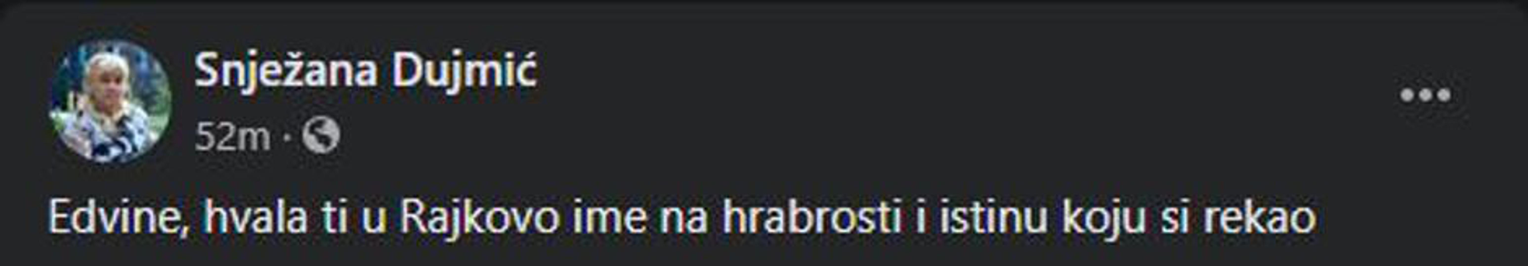 Podsjetimo, glazbeni menadžer je na Facebooku prozvao glazbenikove kolege za koje smatra da nisu iskreni. "Čitam puno toga danas o Rajku Dujmiću! Većinu vas može biti sram! Svi se razmećete i pišete, opraštate se, gdje vam moral, bar stid, sram... Pa da šutite, a opet znam ne možete, zovu vas svi, morate nešto reći, mnoge vas je stvorio, treba javnosti reći i izreći da je bio genije, a da pređete crtu i povučete sve gnjusnosti koje ste mislili i izgovarali o njemu!? I želite se jako pokazati kako ste ga poštovali, voljeli, čuli se s njim svaki dan, živjeli s njim njegove probleme, a najogavnije riječi sam osobno čuo iz vaših usta i svjedok sam vaše bezobzirnosti, i svi sad prepričavate svoje prelijepe dogodovštine i susrete, da bi ukrali za sebe dio njegove popularnosti jer vam sad treba da biste se pojavili u medijima i, vidim, svi imate fotke s njim stare po tko zna koliko godina i svi ste mu bili veliki prijatelji, a nikad do sad to nigdje niste objavili", započeo je menadžer i nastavio: