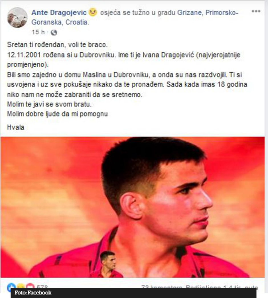 – Sretan ti rođendan, voli te braco. 12. 11. 2001. rođena si u Dubrovniku. Ime ti je Ivana Dragojević (najvjerojatnije promijenjeno). Bili smo zajedno u domu Maslina u Dubrovniku, a onda su nas razdvojili. Ti si posvojena i uza sve pokušaje nikako da te pronađem. Sada kad imaš 18 godina nitko nam ne može zabraniti da se sretnemo. Molim te, javi se svom bratu – napisao je Ante i zamolio dobre ljude za pomoć. Mnogi su odmah nudili savjete za pomoć u komentarima, a njegova je objava u manje od 24 sata podijeljena više od 2500 puta na Facebooku. Takvoj se reakciji, priznaje, ni sam nije nadao.