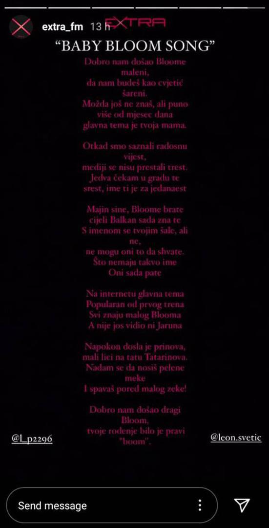 Nakon što smo jučer doznali ime prinove pjevačice Maje Šuput (41) mediji i fanovi ne prestaju pričati o neobičnom imenu koji nosi maleni dječak. Naime, klupko veselja Maje i supruga Nenada, Bloom Tatarinov je upravo zbog toga postao zvijezda preko noći i otišlo je toliko daleko da je radijska postaja Extra FM organizirala grupno pisanje teksta sa svojim pratiteljima, odnosno slušateljima, a odaziv je nevjerojatan. Najprije su pjesmu započeli djelatnici, a pratitelji su je nadogradili.