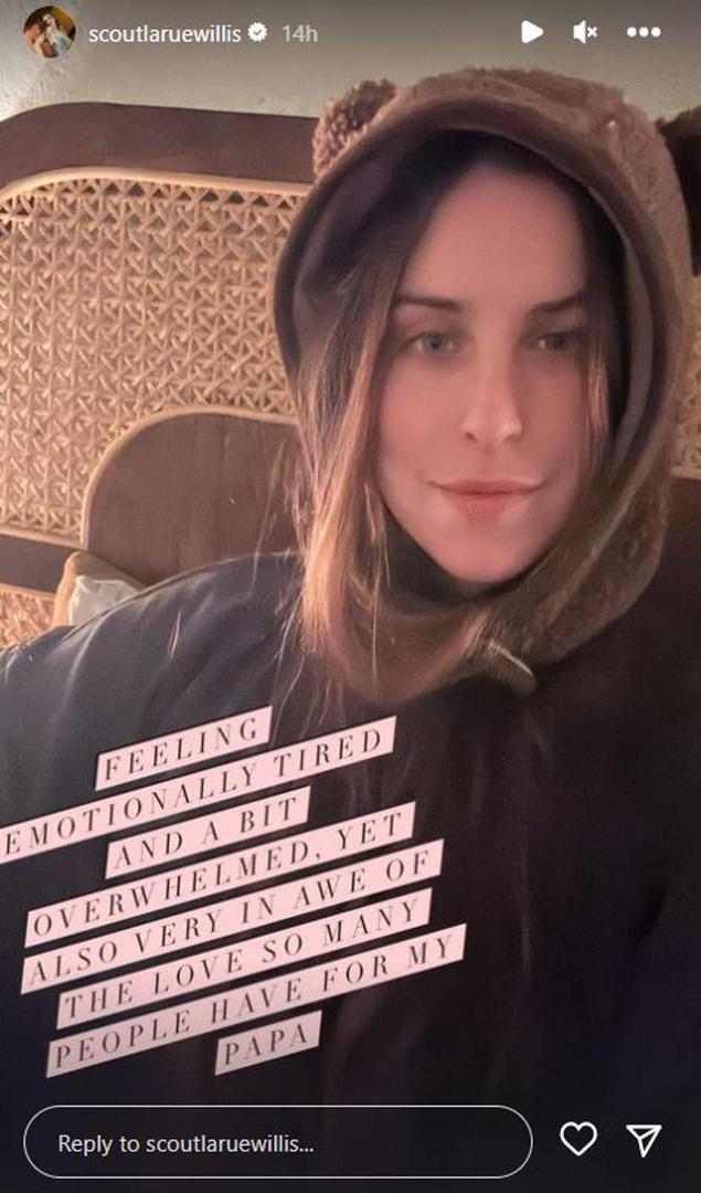 - Osjećam se emocionalno umorno i malo preplavljena osjećajima, ali sam i zadivljena ljubavlju koju toliko ljudi ima prema mom ocu - napisala je uz fotografiju. Ona je inače 31-godišnja glazbenica koju je glumac dobio u braku s Demi Moore. Nakon objave javila se i njena sestra Rumer koja je napisala kako osjeća svu ljubav koji obožavatelji šalju njihovom ocu i cijelo obitelji, ali i da je i ona emocionalno umorna.