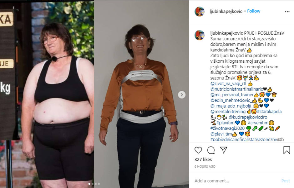 Ljubinka Pejković, sudionica pete sezone RTL-ovog showa "Život na vagi", na Instagramu je objavila fotografije na kojima se vidi koliko je uspjela smršaviti tijekom showa.