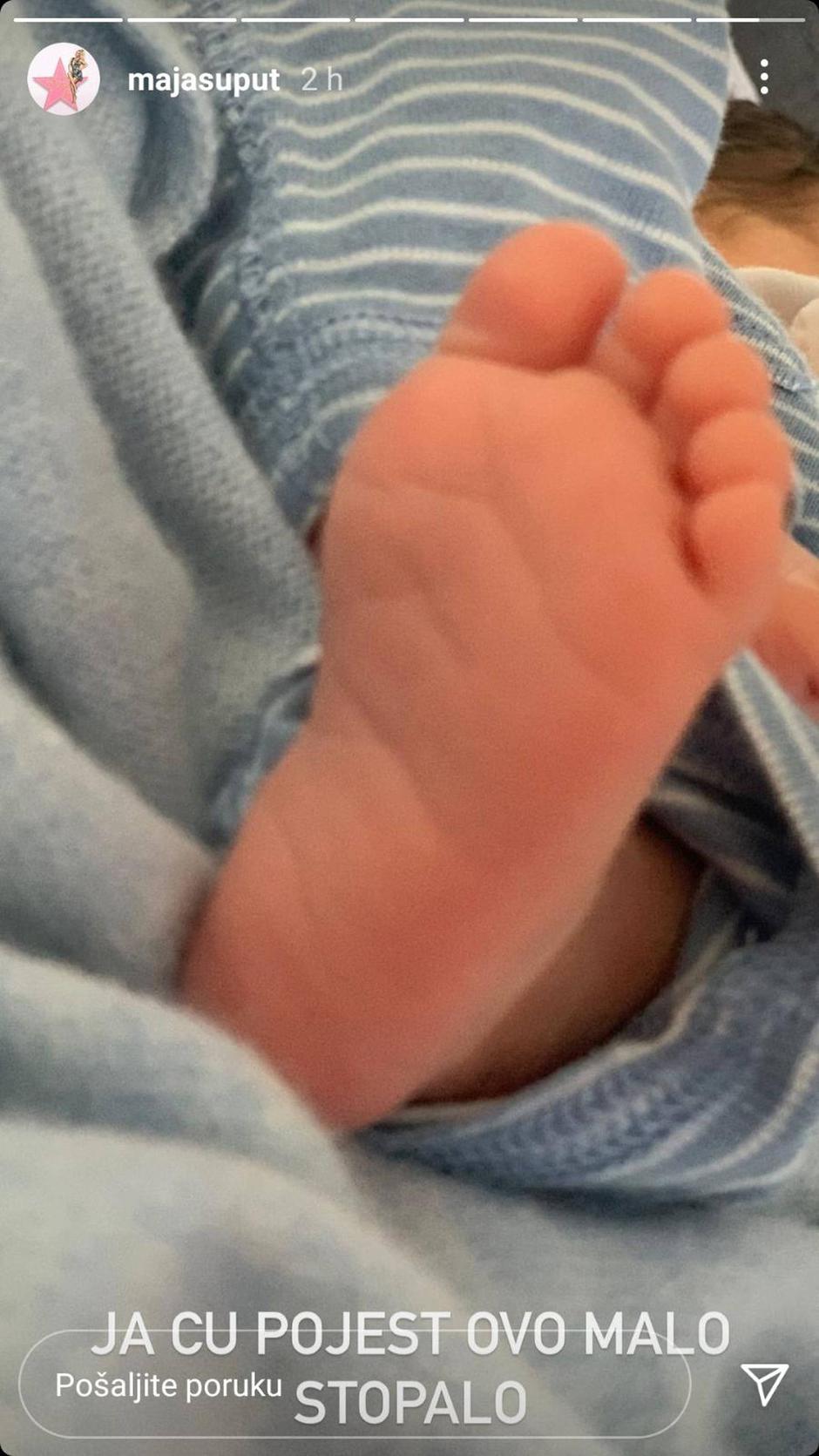 Na Instagram story potom je objavila i maleno stopalo prvorođenca koji je obučen u plave hlačice.