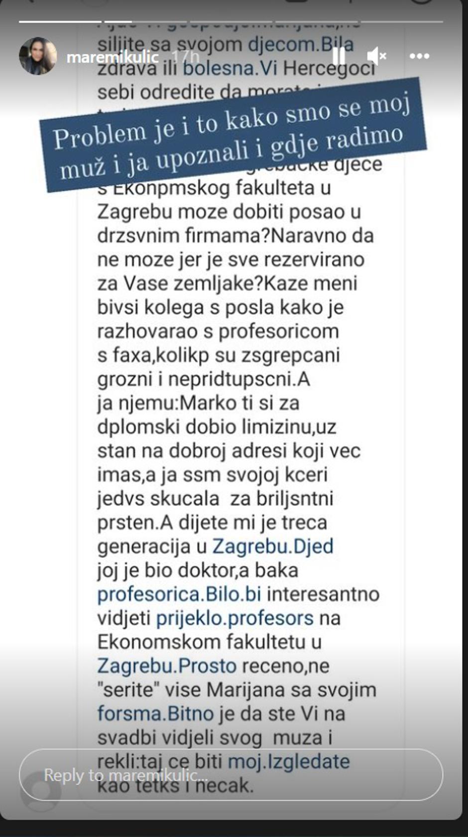 - Koliko zagrebačke djece s Ekonomskog fakulteta može dobiti posao u državnim firmama? Naravno da ne može jer je sve rezervirano za vaše zemljake. U nastavku te poruke problem joj stvara i kako su se Marijana i njezin suprug upoznali.
