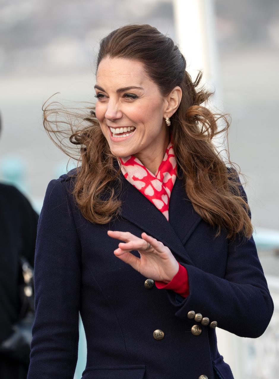 Umjesto "lijepe" haljine, Kate je odabrala dugački, mornarskoplavi kaput iz Hobbsa, čija je cijena oko 349 funti i kombinirala ga s crvenom pletenom haljinom iz Zare, visokim crnim čizmama, Mulberry torbom i Beulah maramom s uzorkom srca.