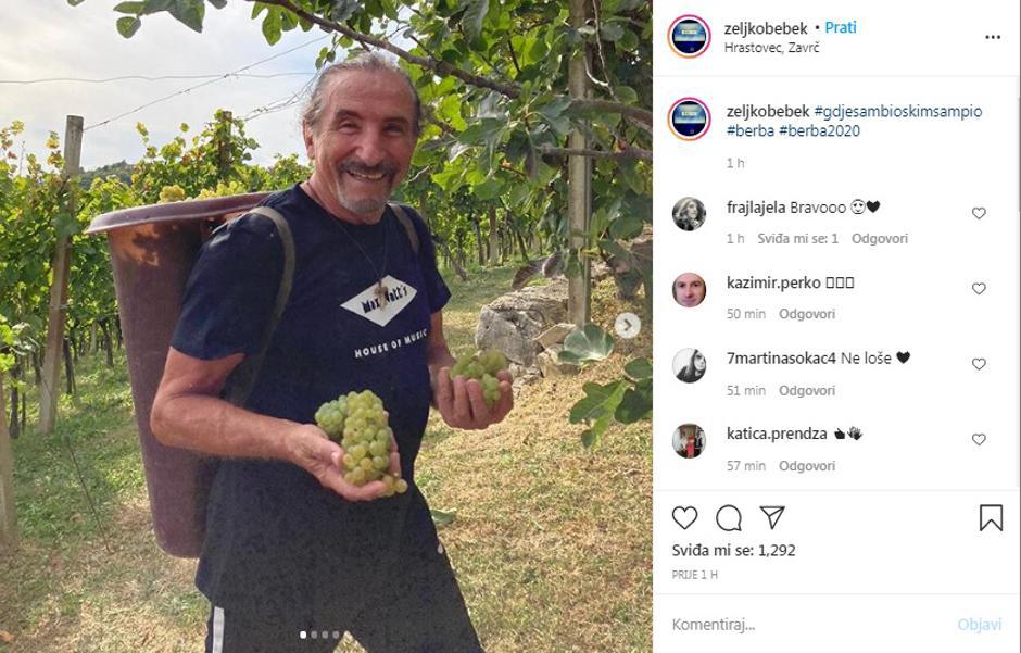 Legendarni pjevač Željko Bebek pauzu od nastupa iskoristio je za berbu u vinogradu, a na Instagramu je objavio fotografiju na kojoj nasmijan pozira s bijelim grožđem, uz hashtag svog velikog hita "Gdje sam bio, s kim sam pio".