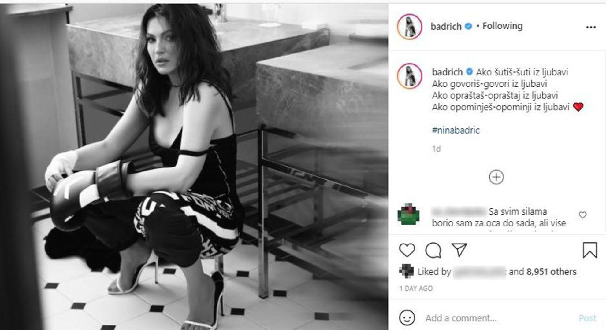 - Ako šutiš-šuti iz ljubavi. Ako govoriš-govori iz ljubavi. Ako opraštaš-opraštaj iz ljubavi. Ako opominješ-opominji iz ljubavi, napisala je Nina pokraj fotografije, citiravši kršćanskog filozofa Aurelija Augustina.