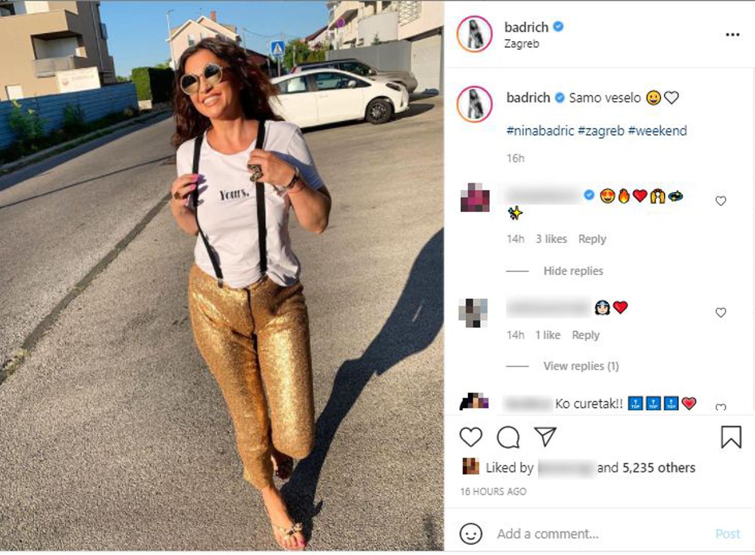 Glazbenica Nina Badrić (49) na svom je Instagram profilu podijelila nekoliko fotografija na kojima pozira u hlačama sa zlatnim šljokicama i bijeloj majici s natpisom. Kombinaciju je dodatno podigla crnim tregerima i kožnom torbom. "A gdje ćemo danas?", napisala je u opisu ispod jedne od fotografija. „Ne komentiram baš po Instagramu, ali kad se spomene "zgodna žena" vise me ne asocira na Juliju Roberts već na Ninu“, poručila joj je jedna pratiteljica, a glazbenica joj je odgovorila srcem. Još neki od komentara su bili da je najljepša, da joj najljepše stoji osmijeh, kao i da je žena za sva vremena.