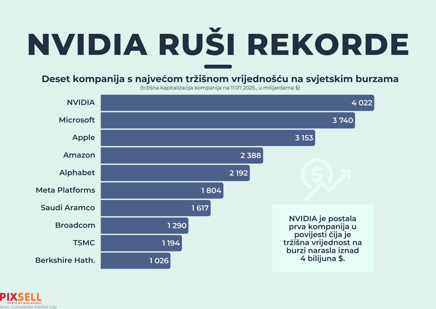 Tehnološki div Nvidia srušio je povijesni rekord i postao prva kompanija na svijetu čija je tržišna kapitalizacija premašila 4 bilijuna američkih dolara. Prema podacima s burze od 11. srpnja 2025., vrijednost Nvidie dosegnula je impresivne 4,022 milijarde dolara, čime je pretekla dosadašnje lidere Microsoft (3,740 mlrd. $) i Apple (3,153 mlrd. $).